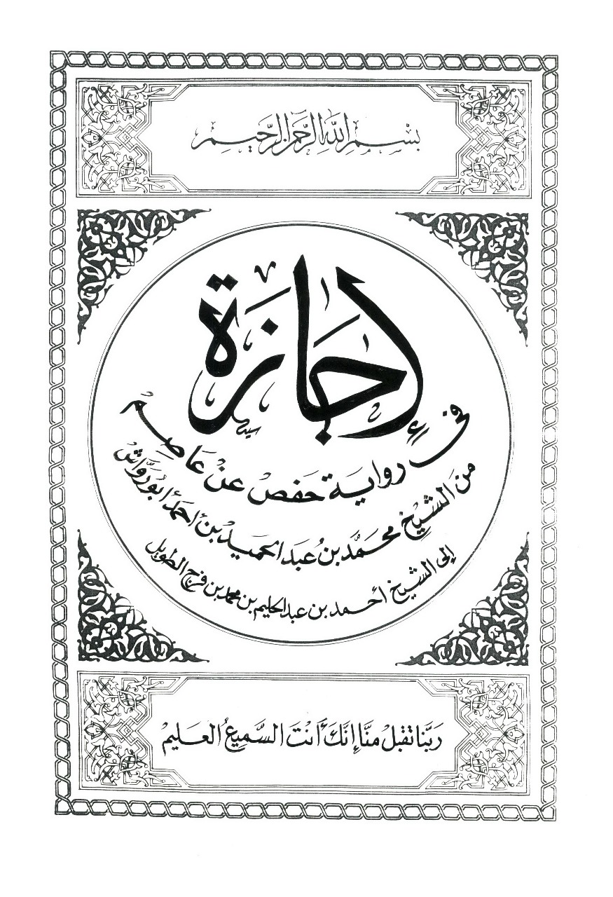 من الشيخ عبد الحكيم عبد اللطيف عبدالله سليمان شيخ عموم المقارئ المصرية، وشيخ مقرأة الجامع الأزهر سابقًا إلى الشيخ أحمد عبد الحليم محمد فرج الطويل
